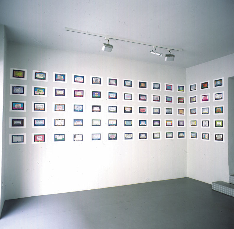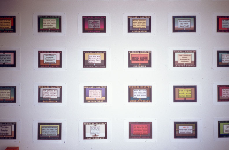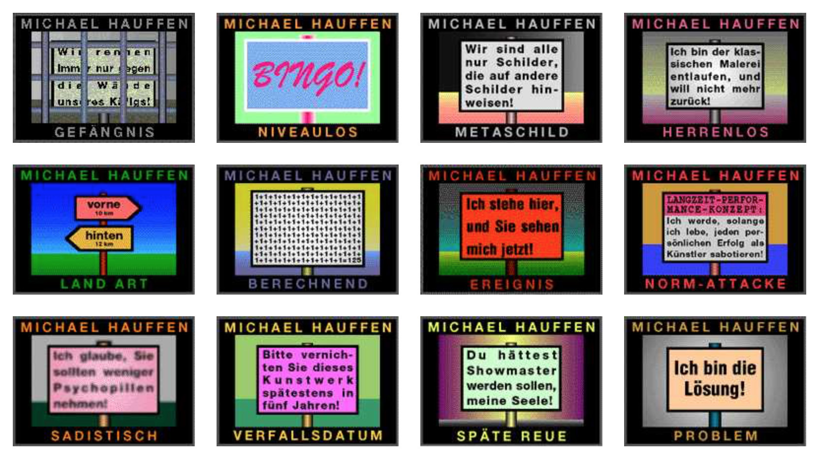 Anfang der 90er Jahre wurde mit dieser Serie institutional critique in der Weise praktiziert, dass die Institution des "genialen Künstlers" ironisch und radikal zur Zielscheibe einer Entlarvungsstrategie gemacht wurde. Dazu dienen zugespitzte Statements, wie man sie zumeist schon einmal gehört zu haben glaubt, die akurat in ein Kategoriensystem geordnet und als fiktive Schilder ausgeführt sind, so als ob sie in verschiedenen mentalen Räumen des Kunstbetriebs jederzeit auftauchen könnten. Die komplette Serie wurde erstmalig in der Galerie Christian Gögger gezeigt und in Form eines Katalogheftes dokumentiert. Einzelne Motive oder Motivserien in verschiedenen Zusammensetzungen wurden als Editionen angeboten oder sogar in Form einer Rauminstallation "begehbar" gemacht.