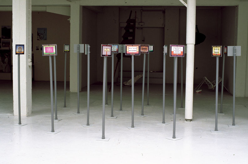 Ansichten von Schildern bilden eine umfangreiche Serie von zugespitzten Statements. Mit ihnen wird institutional critique dezidiert und in den vielen verschiedenen Falten des Kulturzusammenhangs konkretisiert. Nicht nur der geniale Künstler wird dabei zum Ziel einer Entlarvungsstrategie. Wenn der Kunstbetrieb als mentaler Raum funktioniert, wird hier in seine autopoietische Dichte von Praktiken und Denkgewohnheiten in quasi organisierter Form interveniert.