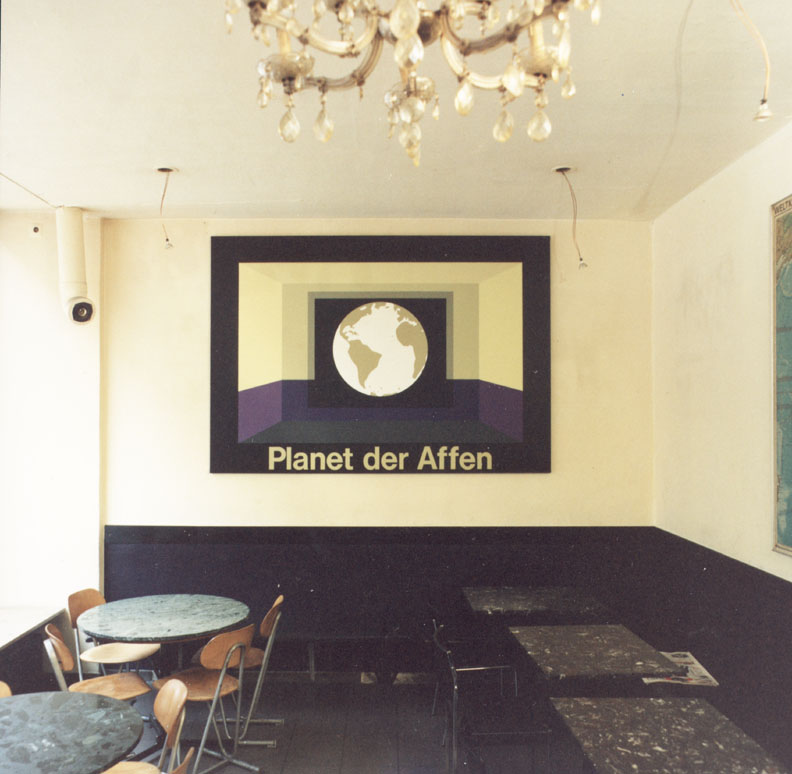 Das Bild „Planet der Affen“ (160x 230 cm) wiederholt die Farben, mit denen die Wände des Kultlokals seit langem bemalt sind, verdoppelt den Raum, und erweitert ihn um ein fiktives Fenster. Dadurch entstehen sich überkreuzende Bezüge, die indirekt auf die jeweils eigenen bzw. fremden Ressentiments der Betrachter und ihrer je „Anderen“ anspielen.Die Gäste des Lokals haben sich übrigens inzwischen schon mehrmals per Abstimmung für die Beibehaltung der Wandfarben und des Bildes ausgesprochen. Selbstironie als stabilisierender Bestandteil einer bohemienhaften Subkultur? – man kann darin auch einen Ausdruck des Abrückens von jenen überkommenen Selbstbeschreibungen sehen, die die Unabhängigkeit von Individuen, Gruppen oder Parteien überschätzen. Was nicht ausschließt, dass eine solche Form kollektiver Absage vor allem an die Ideale individueller Freiheit bzw. dem Konformismus neuester Trends, sehr viel eher einer besseren Zukunft mit gerade mehr Autonomie für alle, den Weg bereiten könnte.