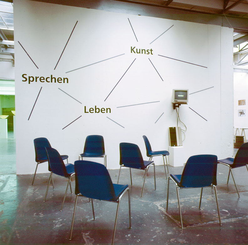 Die Installation "Sprechen über Kunst" reflektiert Vielfalt und Beliebigkeit der Möglichkeiten von Gesprächen über Kunst, und liefert dazu selbst einen Überfluss an Beispielen.Kernstück ist ein Computermonitor, auf dem Wörter in Lesegeschwindigkeit auftauchen, die zusammen längere oder kürzere Satzfragmente bilden, etwa so wie Titel von Kunstwerken oder die Überschriften zu Texten über Kunst.Diese Sätze werden zufallsgesteuert durch Aneinanderreihung einschlägiger Begriffe und verschiedener Konjunktionen (und, oder, ohne ...) gebildet. Die drei Wörter „Kunst“, „Sprechen“ und „Leben“ kommen dabei häufiger vor. Auf diese Weise entstehen Millionen von Kombinationen, die überraschend oft einen Sinn ergeben – jedenfalls wenn man sie als Anregungen zum Nachdenken über aktuelle Kunst wahrnimmt.Ergänzt wird die Installation durch ein Diagramm, das den netzwerkartigen Zusammenhang der Begriffe visualisiert, 8 Stühle, auf denen Kunstinteressente und -nichtinteressierte Platz nehmen können, und einen Text, der die verwendeten Algoritmen des „Sinngenerators“ erläutert.Die Installation wurde 1997 in München (Künstlerwerkstätte Lothringerstraße) gezeigt. Außerdem bildete sie die Referenz zu einem Seminar, das ich über mehrere Semester an der Münchner Kunstakademie leitete, in dem es ebenfalls darum ging, mit verschiedenen Formen der Sprache in Bezug auf Kunstwerke zu experimentieren.