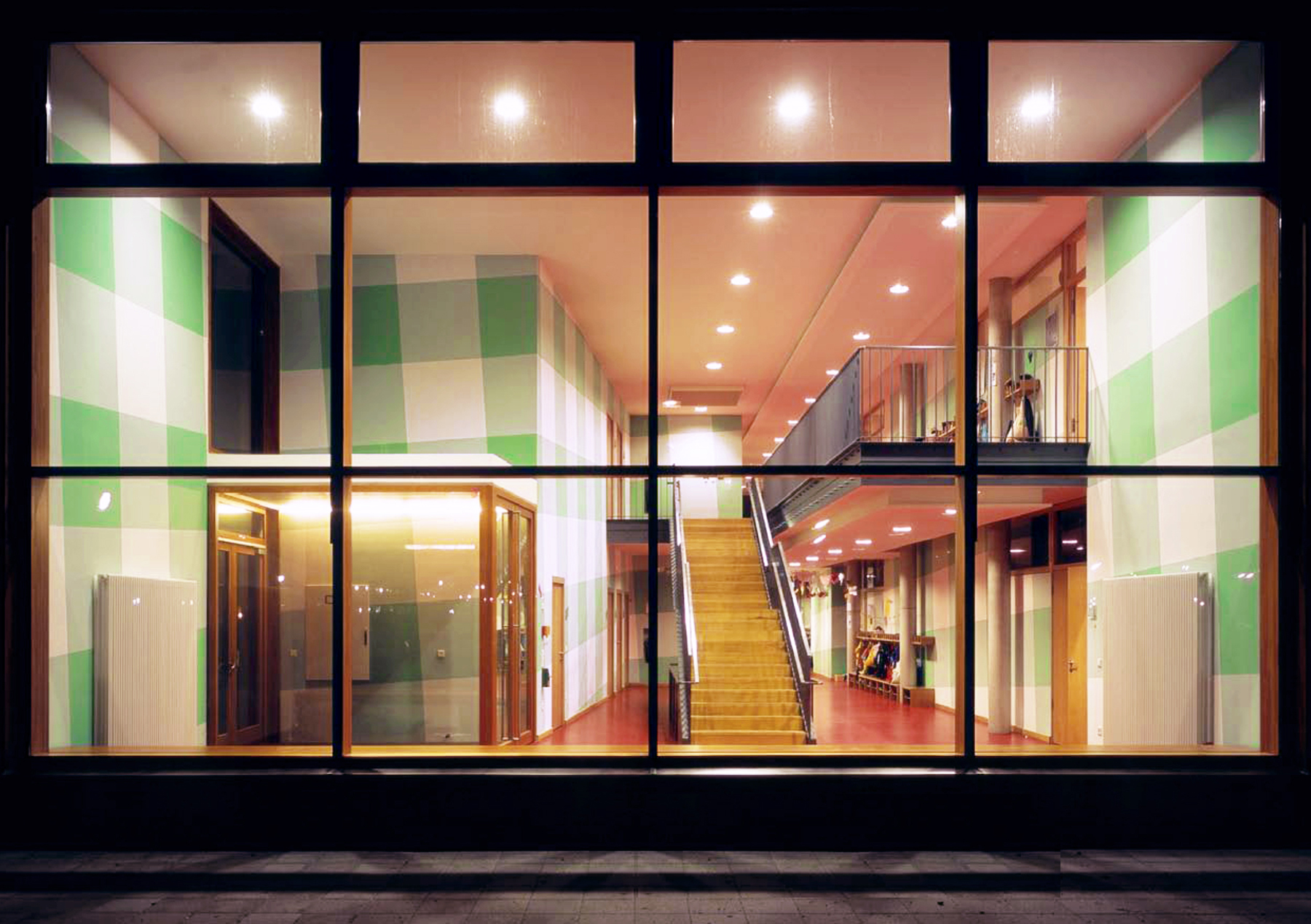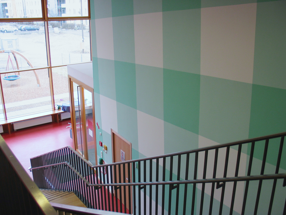 Die Herausforderung der Umsetzung selbstreflexiver Konzepte trifft hier auf die Notwendigkeit, ästhetische Formen auf alltägliche Situationen und Materien treffen zu lassen. Mehr oder weniger zufällig aufgegriffene Elemente aus der Umgebung der "Aufgabe" sollten in einer Weise "anverwandelt" werden, die sie in der genunin bildnerischen Logik als wirkungsvolle Impulse zur Geltung bringt. In der Zusammenarbeit mit Pia Lanzinger (mit der zusammen neben einem realisierten Kunst-am-Bau-Projekt eine ganze Reihe von Wettbewerbsbeiträgen erarbeitet wurden), standen vor allem Formen partizipativer und kollaborativer Modelle im Fokus. Die oben abgebildete Arbeit in einer Kindertagesstätte in München verwendet das Motiv des Karomusters, um einerseits eine markante und im Sinne der Moderne klar konstruktive Farbgestaltung in den zentralen Raum zu bringen, und andererseits jenen vertrauten Ton des alltäglich Selbstverständlichen anzuschlagen, der die verbreitete Abwehrhaltung gegenüber moderner Kunst dann auch definitiv brach.