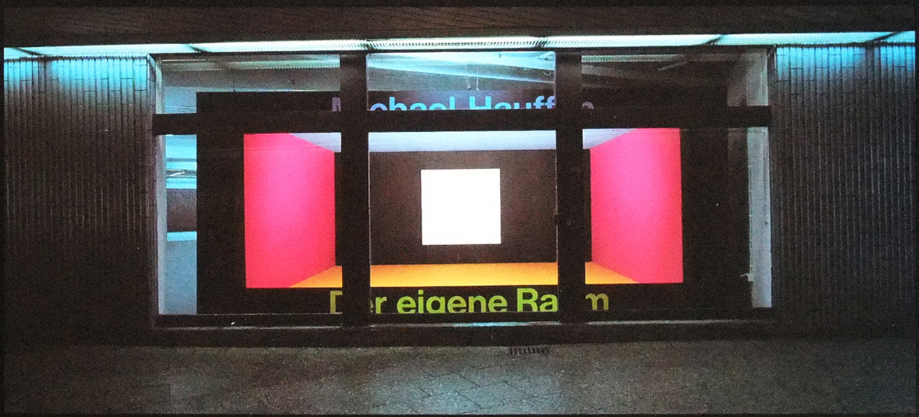 Bestandteil der Installation war dieser Text: Die klassische Zentralperspektive ist eine Schachtel, die die Fiktion einer geordneten Welt erlaubt, und so den Wunsch des „klassichen Betrachters“ erfüllt. Damit gehört sie einem allgemeinen System von Behältern an, das diese als getrennte Einheiten behandelt, die über verschiedene Kanäle verbunden und bewegt werden. In der hohen Verdichtung einer modernen Großstadt, bei extremer Beschleunigung, erreichen diese Raum-Atome die Grenze ihrer Bestimmbarkeit, insofern der Inhalt jeder Schachtel in jeder anderen simuliert werden kann. Das Verlangen nach Gewißheit führt die Vielfalt auf eine Elementarform zurück: container mit Fenster. Seiner „Hintergrund“-Funktion entledigt, bildet dieses „Schema“ den aktiven Kern einer freiwerdenden Energie, und verbirgt nicht mehr sein wesentliches Schweben in prekärer Situation. Die Zentralperspektive stellt damit eine Basis dar, von der aus die Malerei in eine radikaltere Wirklichkeit springen kann. Das Vorkommen dieses Sprungs läßt sich von keiner Norm ableiten, und durchzeitigt deshalb die berechenbare Welt als gefährliches Potential. Im Aufblitzen dieses Potentials erkennt sich der „klassische Betrachter“ als die Fiktion, die der „eigene Raum“ ist...