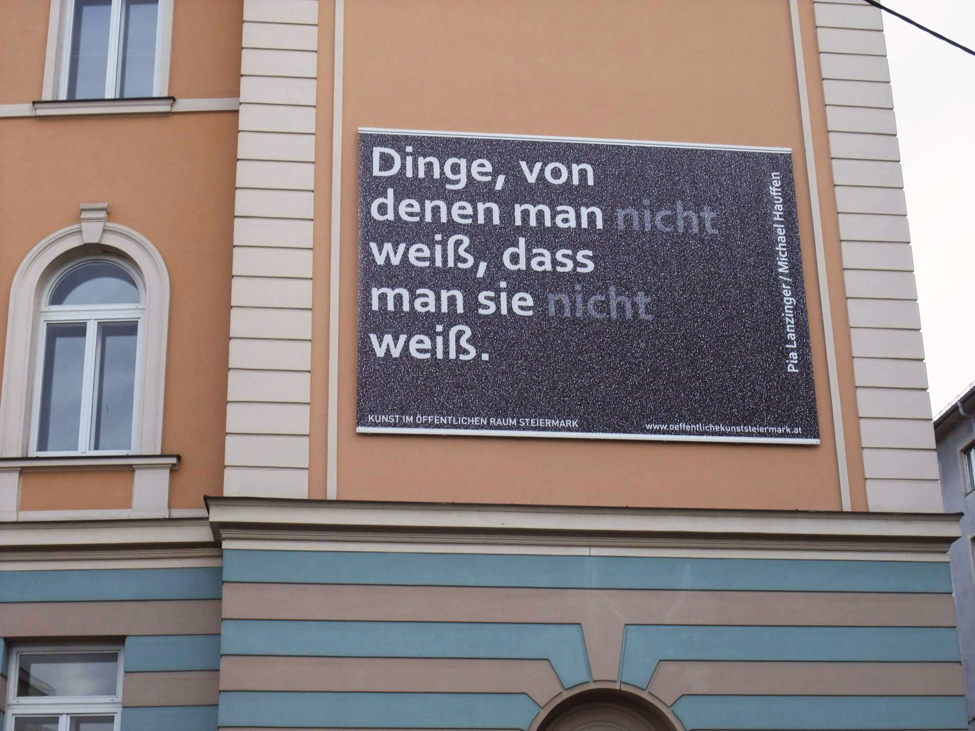 Wissen spielt heute eine herausragende Rolle, es stellt eine Produktivkraft ersten Ranges dar. Aber unsere globale Gesellschaft ist trotz eines extremen Wissenszuwachses offenbar den Lösungen für die dringendsten Probleme nicht wirklich näher gekommen. Es hat sich sogar der Eindruck verstärkt, dass gerade das Wissen, jedenfalls in der Form wie es vorherrschend praktiziert wird, eine Quelle neuer, in dieser Größenordnung bisher nicht gekannter Gefahren darstellt (etwa bei Atomkraft, Kreditwesen oder globalpolitischen Fehlentscheidungen). Als Ausweg aus diesen Dilemmata könnte sich ein Wissen zweiter Ordnung anbieten, zu dessen Vorgehensweisen auch Methoden zählen, die bisher nur der Ästhetik zugeordnet werden. Und aus dieser Überlegung heraus wurde am Beispiel eines formelhaften Aussage-Satzes, der eine Äußerung des früheren US-amerikanischen Verteidigungsministers Donald Rumsfeld aufgreift, ein logisches Experiment grafisch umgesetzt. Das kombinatorische Resultat bilden vier verschiedene Statements, die als visuelle Einheit den Anspruch allgemeingültiger Aussagesysteme in Szene setzen. Neben der selbstgewissen Aussage, “wissen, was man weiß”, der Erkenntnis der eigenen Begrenztheit, “wissen, was man nicht weiß” und der Rumsfeld’schen Pointe, “nicht wissen, was man nicht weiß”, wird dabei noch als vierte Möglichkeit, mit “nicht wissen, was man weiß”, die Struktur des unbewussten Wissens mit eingeschlossen (die Pointe von Slavoj Zizek). Als Plakat im öffentlichen Raum wirft die Arbeit die Frage nach den logischen Grenzen und Möglichkeiten des Wissens auf und verweist auf den Hintergrund ethischer Voraussetzungen, die spätestens bei der praktischen Anwendung dieses Wissens ins Spiel kommen. Beitrag für die Reihe "IN DIE STADT EINSCHREIBEN", Kunst im öffentlichen Raum Steiermark (Graz), (zusammen mit P.L.)